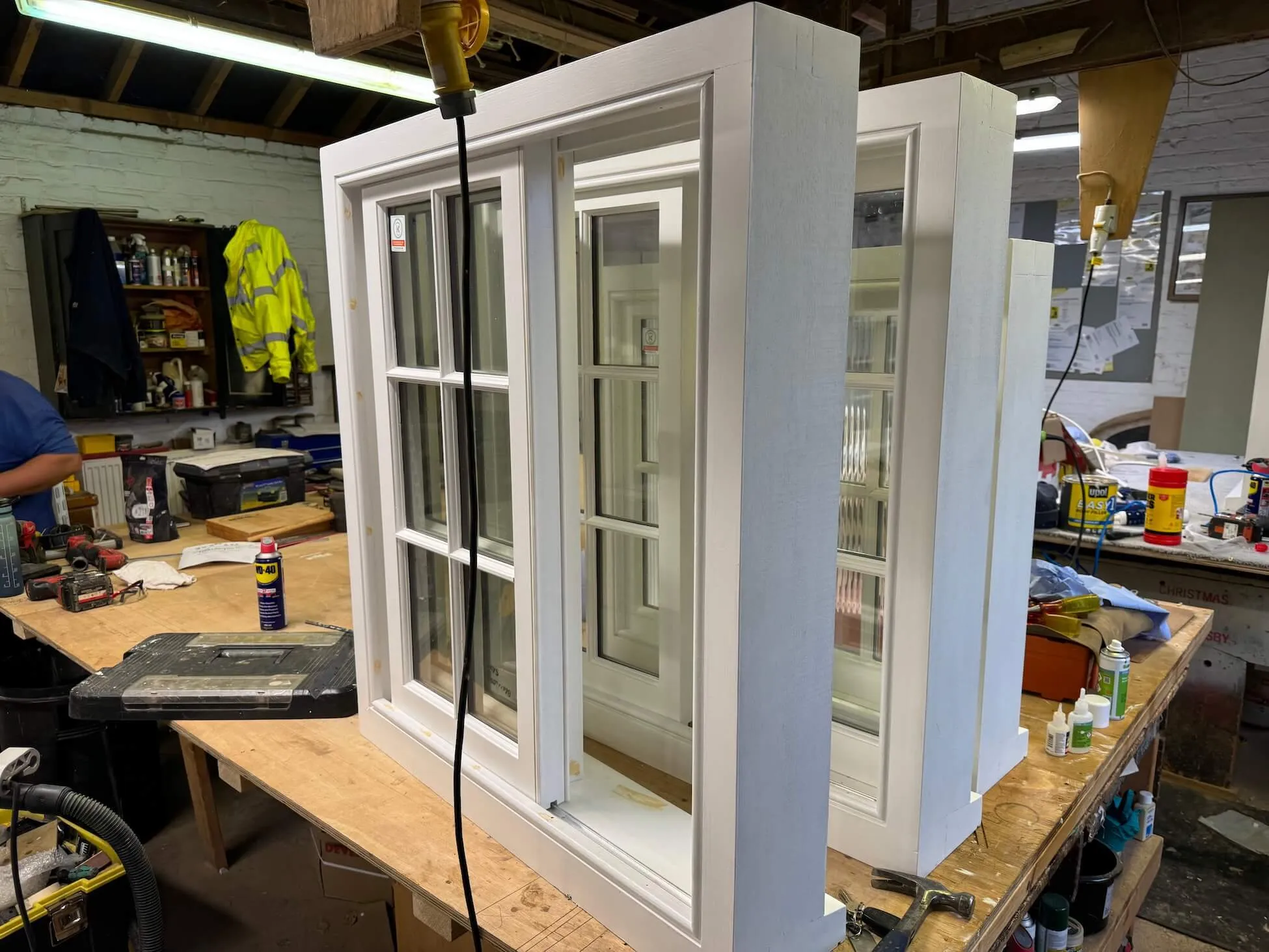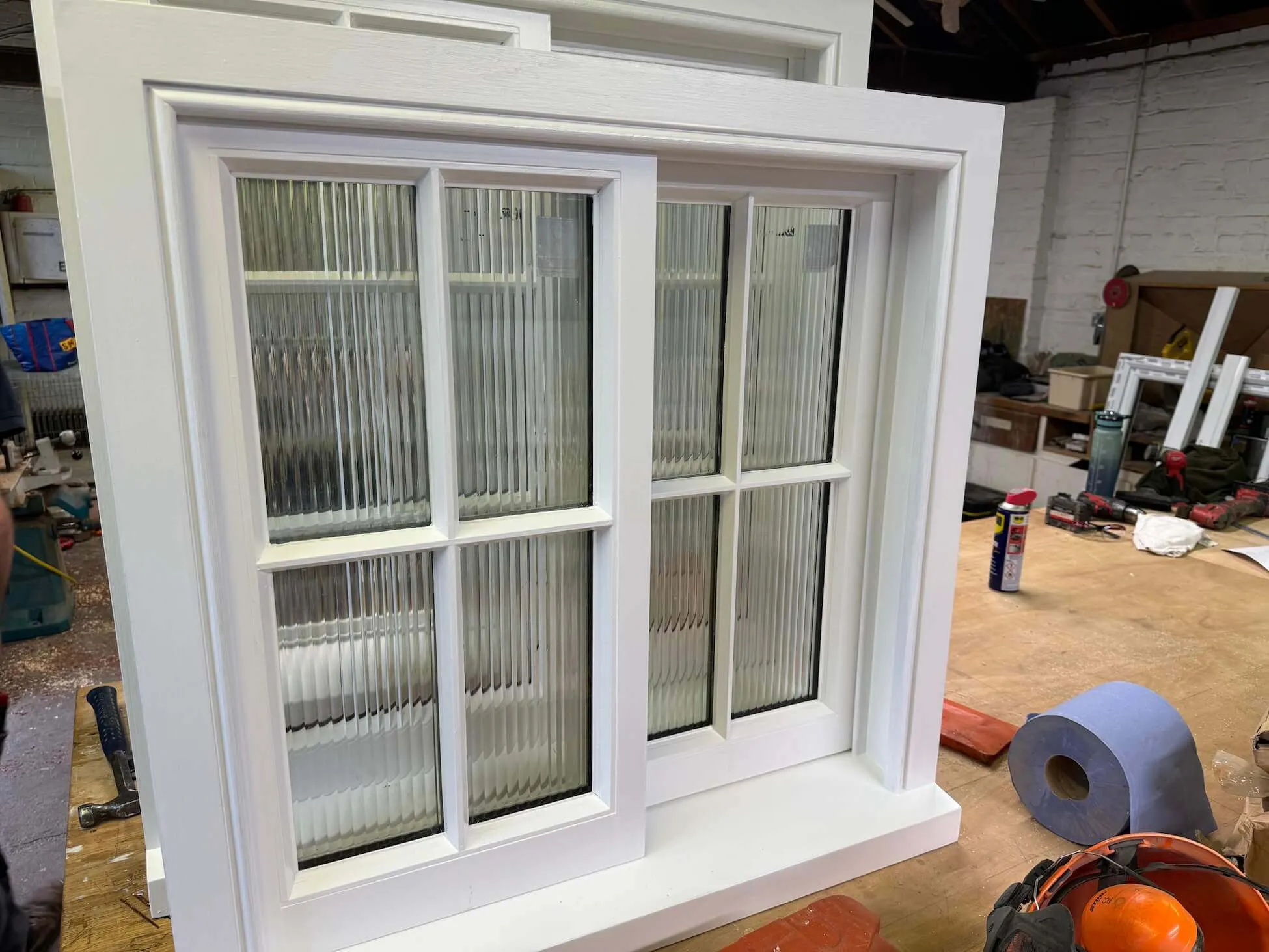 The timber was machined to the original design of a York slide window, but we added in additional weather details. Once the frames and sashes were assembled, we applied six coats of Dulux Weathershield paint and the sashes were glazed with either clear or reeded, 20mm argon-filled double-glazed glass units.